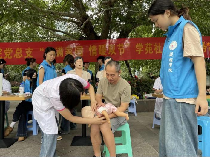 活动现场气氛热烈。师生们发挥专业特长,为社区老人进行血压测量,给予个性化的健康指导;在急救知识科普区,通过模拟演示与手把手教学,培训心肺复苏、海姆利克等实用急救技能,为有小朋友的家庭展示婴幼儿生活护理操作。活动现场还设置了健康知识问答与趣味猜灯谜环节,内容紧密结合秋季养生常识、中秋传统文化等内容,形式生动有趣,社区群众在欢声笑语中学习了知识,感受到了浓厚温馨的节日氛围。
