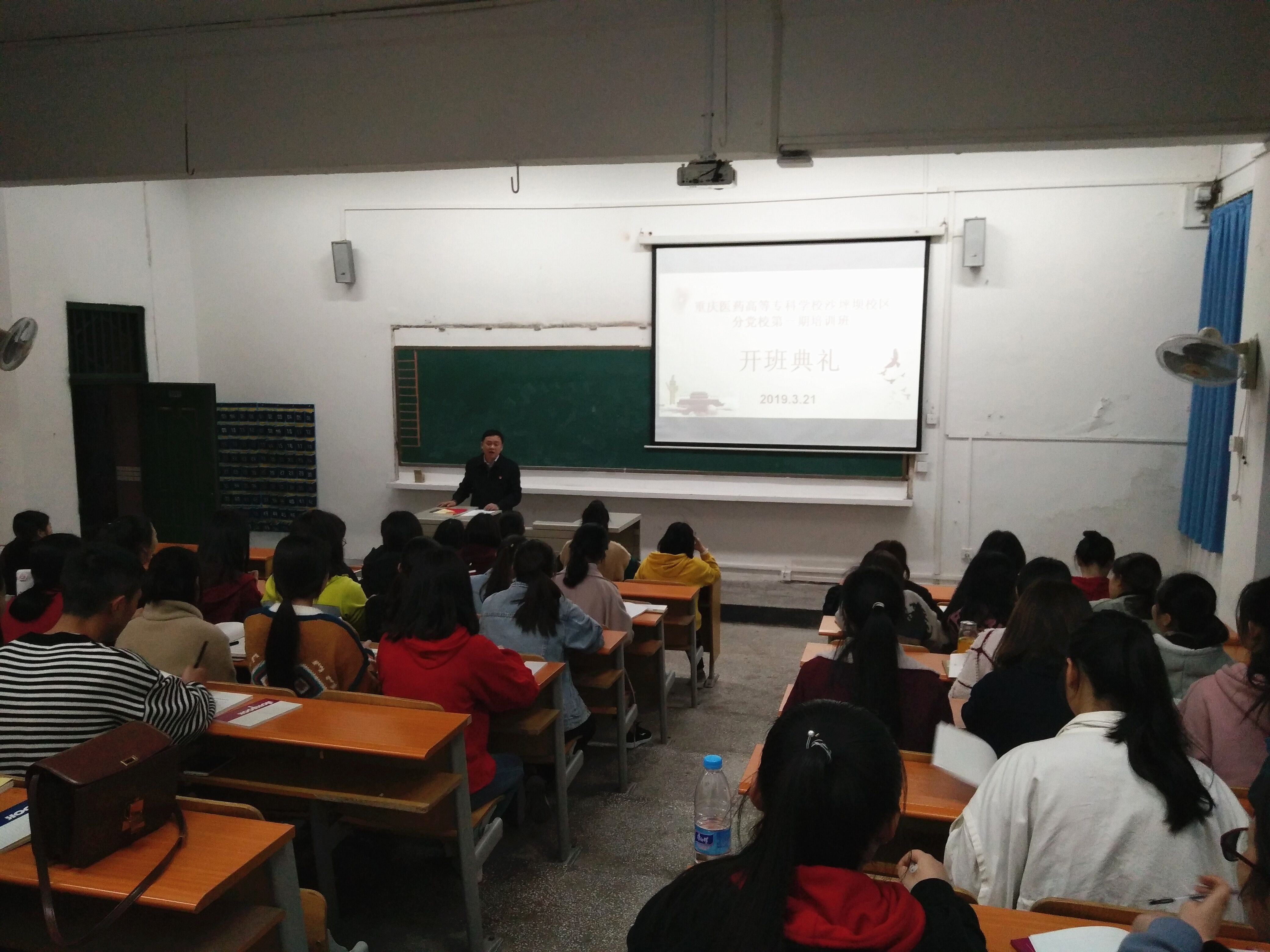 3月21日晚7点,沙坪坝校区业余分党校第一期培训开班典礼暨第一次党课学习在1001教室举行,共64名同学参加。校区管委会直属党支部书记、管委会主任黄晓可对参加本期学生业余党校培训班的同学表示热烈的欢迎和衷心的祝贺。他指出,大学阶段是确立人生观、世界观和价值观的关键时期,青年人要肩负实现中华民族伟大复兴的历史使命,希望广大学员们珍惜学习机会,积极学习党的基本知识,增强对党的了解,坚定跟党走的信念。班主任张逍老师对培训作了要求,强调同学们要遵守纪律,认真听讲,结合实际书写学习心得。