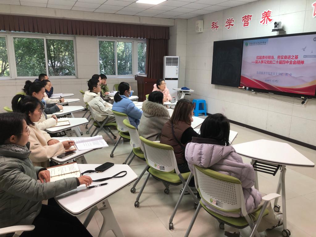 三是笃行实干,为推动“十五五”规划落地落实贡献力量。黄舟书记结合职业教育发展趋势和学校、学院“十五五”时期的发展目标任务,号召全体师生将学习全会精神的成效转化为推动工作的强大动力。她指出,教师党员要牢记为党育人、为国育才的初心使命,立足本职岗位,提升教书育人本领,勇担科研创新重任;入党积极分子和青年学生要坚定理想信念,锤炼过硬本领,将个人成长融入国家发展和学校建设大局。她特别强调,当前学校正处于奋力实现升本目标的关键时期,全体师生要以高度的责任感和使命感,凝心聚力,在教学、科研、管理、服务等各方面争创佳绩,为学校顺利实现升本目标和高质量发展贡献智慧和力量。