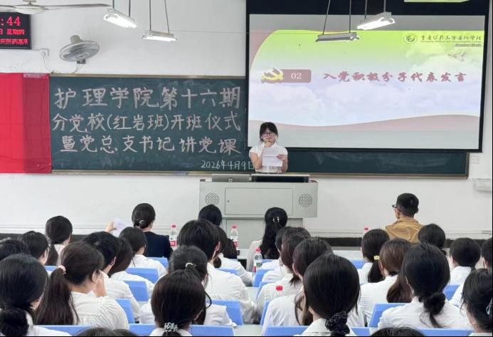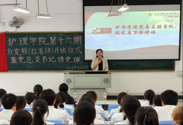 为深入学习贯彻习近平新时代中国特色社会主义思想,落实立德树人根本任务,紧扣传承红医精神、塑造阳光心态育人主线,严把党员发展“入口关”,2026年4月9日,护理学院在教学楼2307教室,举行第十六期分党校(红岩班)开班仪式暨党总支书记讲党课。学院党总支书记杨海英,党总支副书记、院长唐万珍及相关党务工作者出席开班仪式,101名入党积极分子参加活动,开启理论学习与党性锤炼新征程。